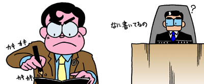 話は、ガラッと変わりますが、同じ日に傍聴した地裁での民事裁判では、第一回公判にもかかわらず、開廷と同時に猛然とノートにメモを書いている原告側弁護士さんがいました。「訴状のとおり、陳述しますか?」など、まだ、何ら動きの無い段階なのに、その鉛筆の運動量たるやスゴイものがありました。今でも、あの“内職?”が何だったのか、気になるところです。 |
